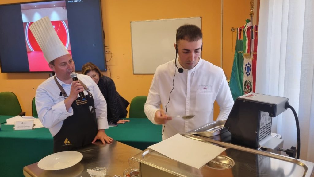 De Vuono, 31 anni, è chef di grande livello: due stelle Michelin presso il ristorante Octavium di Hong Kong. Alunni e docenti delle terze hanno avuto la possibilità di ascoltare la storia del bravissimo cuoco messinese e, subito dopo, di ammirare la sua maestria. Il piatto: orata e caprese.